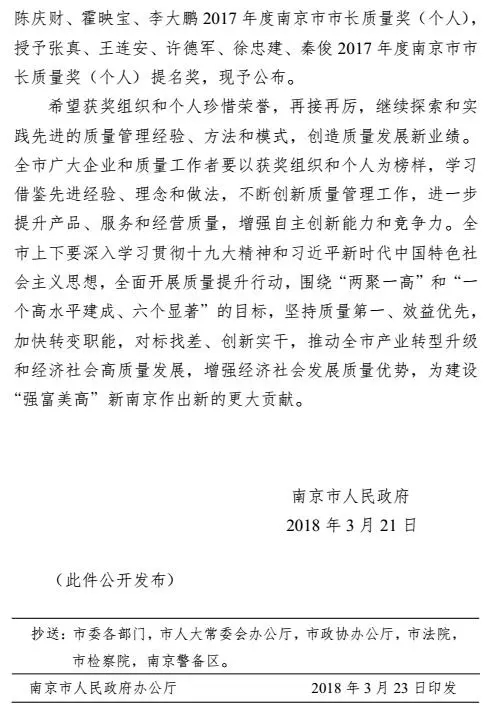 本網(wǎng)訊 日前,南京市人民政府發(fā)文授予中國電子科技集團(tuán)公司第十四研究所等三家單位2017年度南京市市長質(zhì)量獎(組織),授予包括我司在內(nèi)的五家單位南京市市長質(zhì)量獎(組織)提名獎。質(zhì)量獎是企業(yè)運營管理領(lǐng)域最具含金量的獎項,我司始終貫徹“質(zhì)量是生命,信譽是基石,客戶第一,持續(xù)改進(jìn)”的質(zhì)量方針,首次申報就從眾多候選者中脫穎而出,榮獲提名獎,這是社會大眾和政府、專家們對我司質(zhì)量工作的認(rèn)可!更重要的是通過報獎過程,請專家們一起來檢視我們的質(zhì)量管理系統(tǒng),通過申報過程,進(jìn)一步進(jìn)行優(yōu)化完善,然后堅決的執(zhí)行到位,確保企業(yè)高質(zhì)量的運營。
