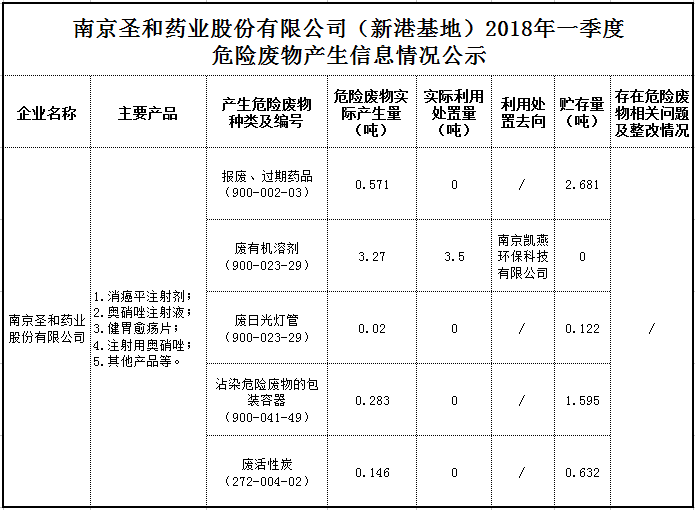 南京圣和藥業(yè)股份有限公司(新港基地)2018年一季度危險廢物產(chǎn)生信息情況公示