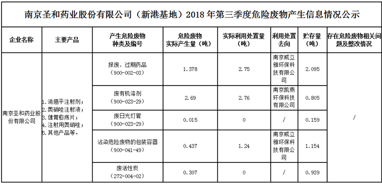 南京圣和藥業(yè)股份有限公司(新港基地)2018年第三季度危險(xiǎn)廢物產(chǎn)生信息情況公示