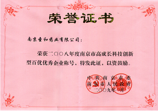 2009年2月1日上午,南京市委、市政府在南京經(jīng)濟技術(shù)開發(fā)區(qū)召開“全市工業(yè)保增長促轉(zhuǎn)型動員大會”,市委書記朱善璐、市長蔣宏坤出席大會,并作重要講話。會上還表彰了2008年度工業(yè)經(jīng)濟先進單位,我公司被授予“二OO八年度南京市高成長科技創(chuàng)新型百優(yōu)優(yōu)秀企業(yè)” 榮譽稱號。