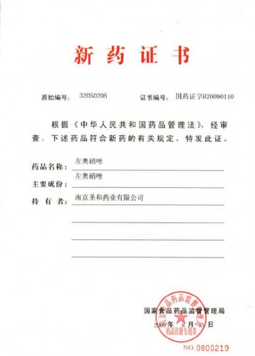 2009年8月15日,我公司具有5項(xiàng)國家發(fā)明專利、2項(xiàng)歐美專利的創(chuàng)新藥左奧硝唑原料及氯化鈉注射液制劑獲國家食品藥品監(jiān)督管理局國家一類新藥證書及生產(chǎn)批件。