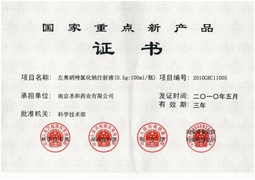左奧硝唑氯化鈉注射液于2009年8月獲得國家食品藥品監(jiān)督管理局新藥證書及藥品注冊(cè)批件,并已獲得國家發(fā)明專利5項(xiàng),國際專利2項(xiàng),并獲得“2009年中國十方處方藥重磅新品”,現(xiàn)已正式上市銷售。