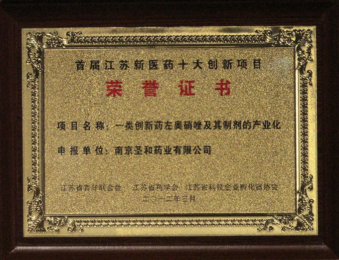 為了深入實(shí)施科教興省和人才強(qiáng)省戰(zhàn)略,促進(jìn)新醫(yī)藥等六大新興產(chǎn)業(yè)的發(fā)展,發(fā)現(xiàn)和凝聚一批青年創(chuàng)新創(chuàng)業(yè)領(lǐng)軍人才,江蘇省青年聯(lián)合會、江蘇省藥學(xué)會、江蘇省科技企業(yè)孵化器協(xié)會聯(lián)合在全省范圍內(nèi)開展了首屆江蘇新醫(yī)藥科技創(chuàng)新創(chuàng)業(yè)項目大賽暨青年科技領(lǐng)軍人才舉薦活動。目前,我司申報的“一類創(chuàng)新藥左奧硝唑及其制劑的產(chǎn)業(yè)化”項目,被授予“首屆江蘇新醫(yī)藥十大創(chuàng)新項目”榮譽(yù)稱號。