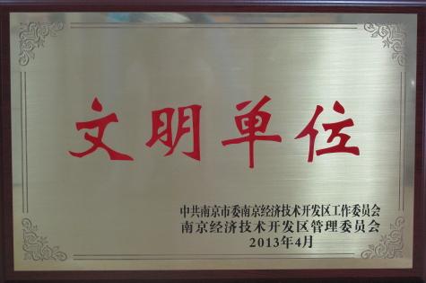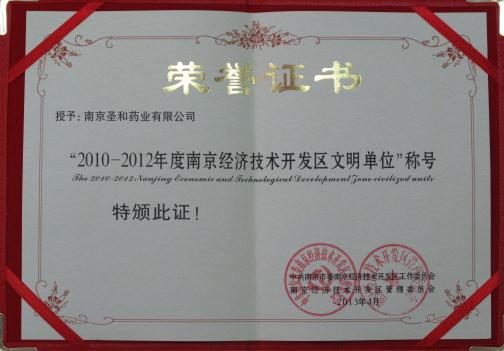 近日,南京經濟技術開發(fā)區(qū)下發(fā)《關于表彰2010-2012年度南京經濟技術開發(fā)區(qū)文明單位的決定》,授予南京圣和藥業(yè)有限公司“2010-2012年度南京經濟技術開發(fā)區(qū)文明單位”榮譽稱號并頒發(fā)證書。