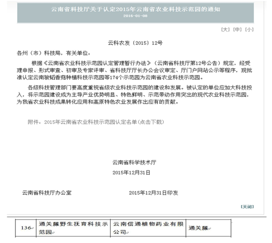 本網(wǎng)訊 1月8日,云南信通植物藥業(yè)有限公司被云南省科技廳批準(zhǔn)認(rèn)定為"云南省農(nóng)業(yè)科技示范園",這是繼"通關(guān)藤野生撫育科技示范園"之后的又一個(gè)重要項(xiàng)目突破。